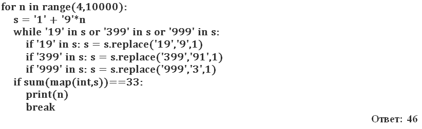 Определите наименьшее значение n, при котором сумма цифр в строке, получившейся в результате выполнения программы, равна 33.